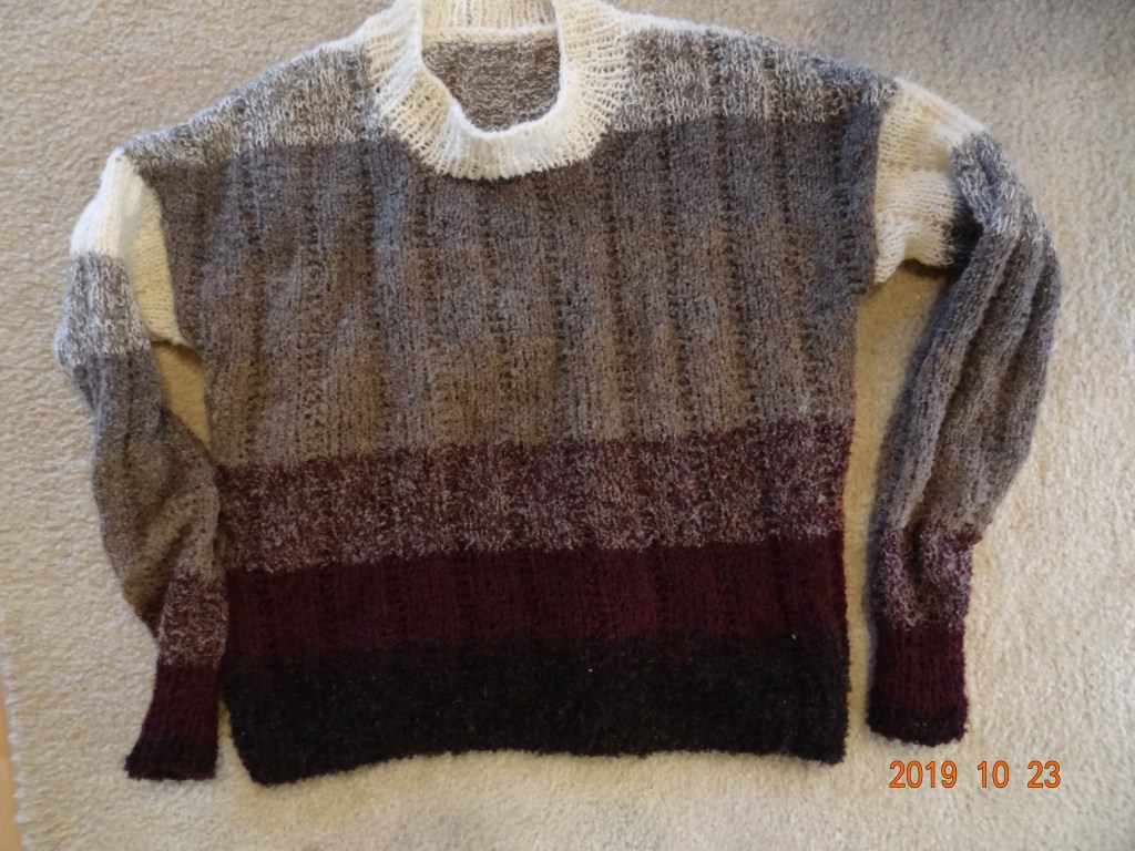 This is one of the sweaters that I’ve finished since I’ve been away. This one is #19 Drop Shoulder Pullover from a winter Vogue Knitting issue from about five years ago. The yarn is a close-out boucle from ICE Yarns purchased through Paradise Yarns. Since Paradise Yarns has such great prices, this sweater cost about $6 in materials and there’s a whole lot more yarn leftover. I’m thinking maybe a hat and legwarmers. I even doubled the yarn.